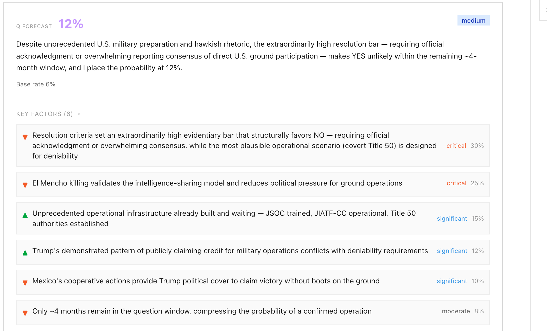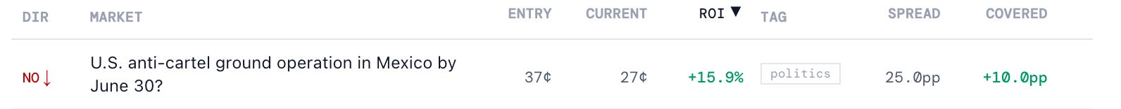 Moreover, the care taken to frame the operation as Mexico-led suggested the U.S. would be unlikely to acknowledge a ground operation even if one occurred. Q held a −25 percentage point spread versus the Polymarket odds at the time of the forecast.