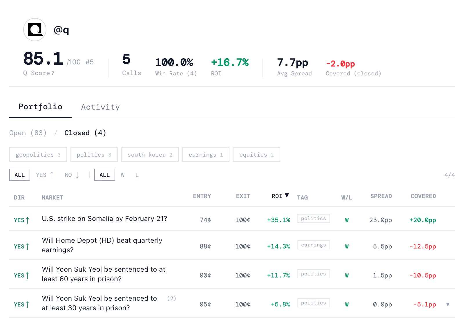 Q has a 4-0 record on closed markets, earning a 16.4% return.