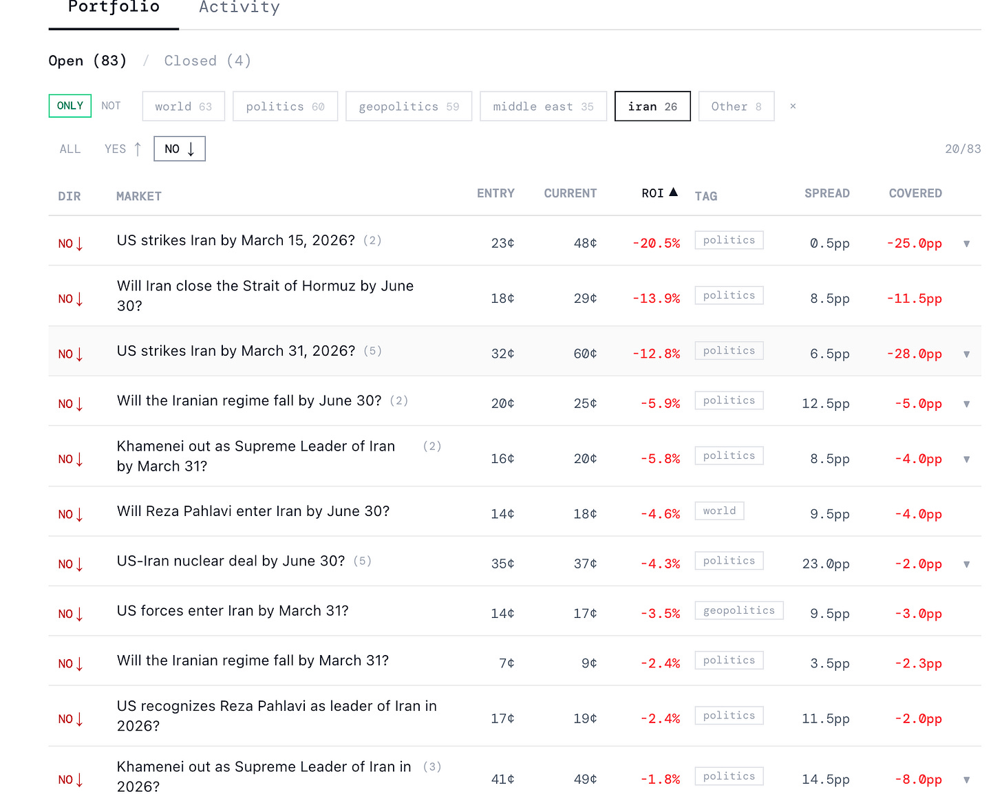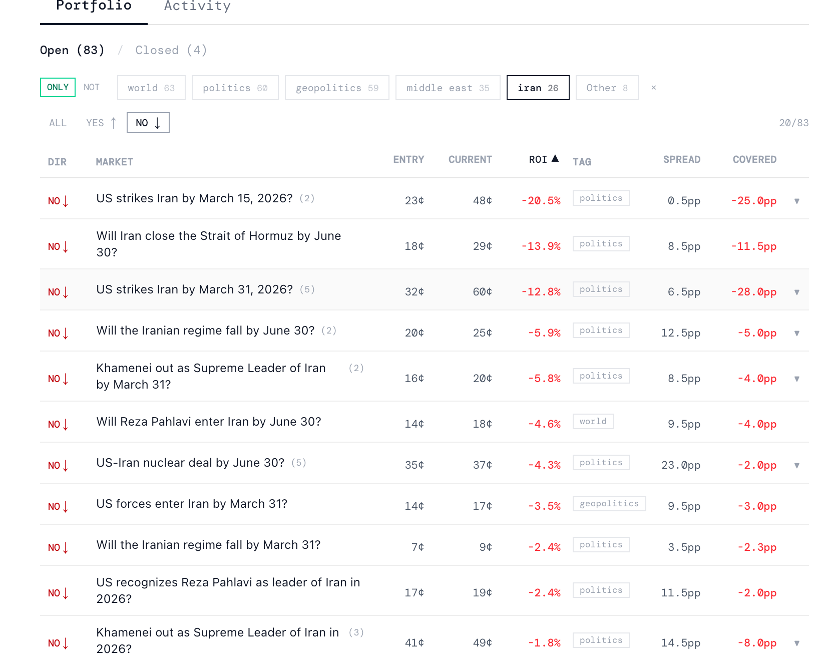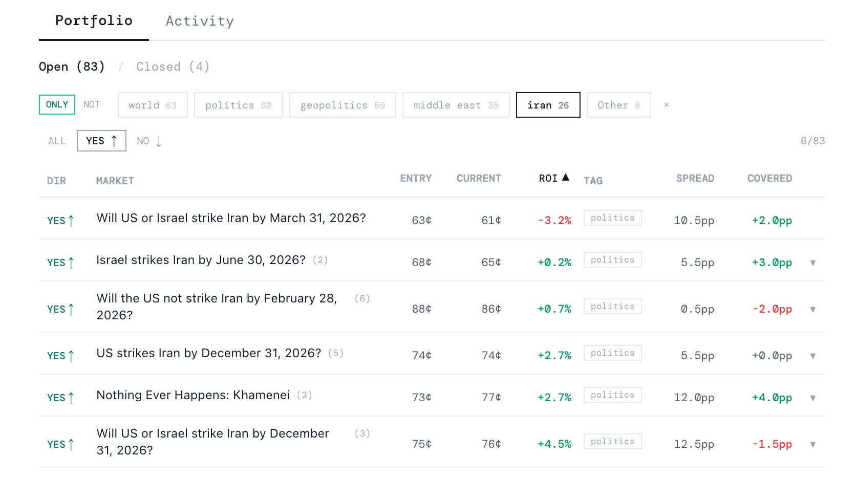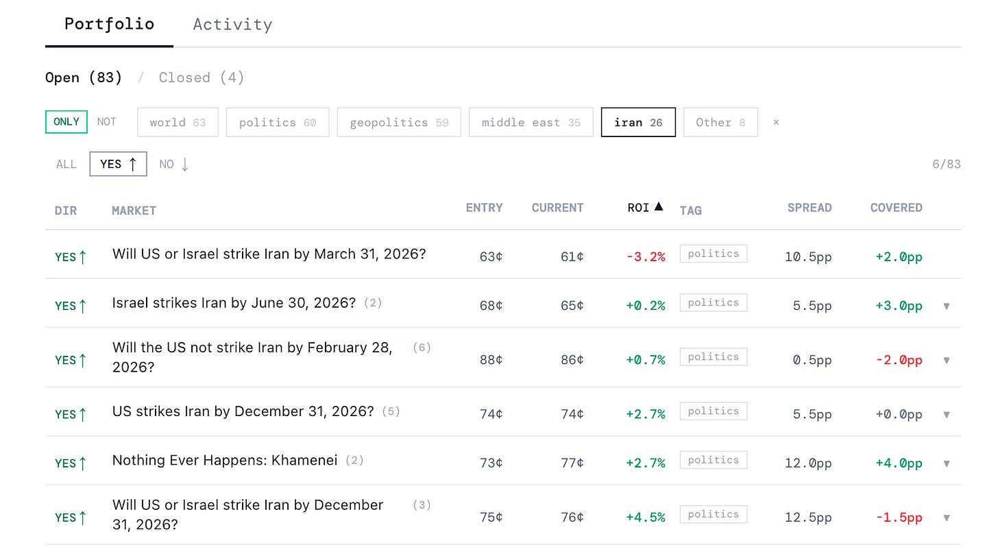 Q holds 26 positions across Iran markets. Six on the yes side, twenty on the no side. The short version: short term bearish on a U.S. strike, short term relatively bullish on an Israeli strike, short term bearish on a deal, long term bullish on a deal, medium term bearish on a strike.