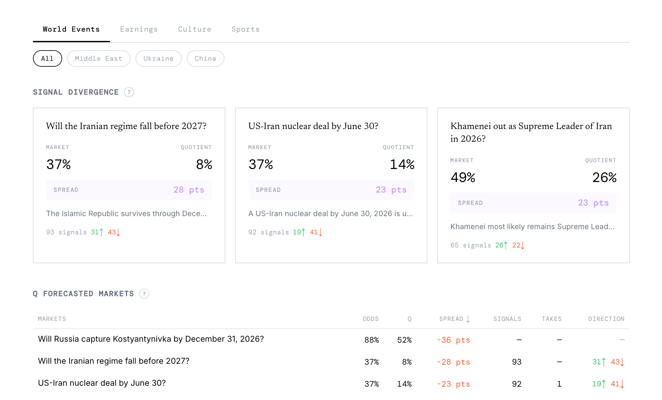 While other prediction market intelligence platforms search for alpha by chasing breaking news first, or reading tea leaves in ambiguous and easily manipulated signals like plane transponders, Q is designed to resist disinformation and rhetoric.