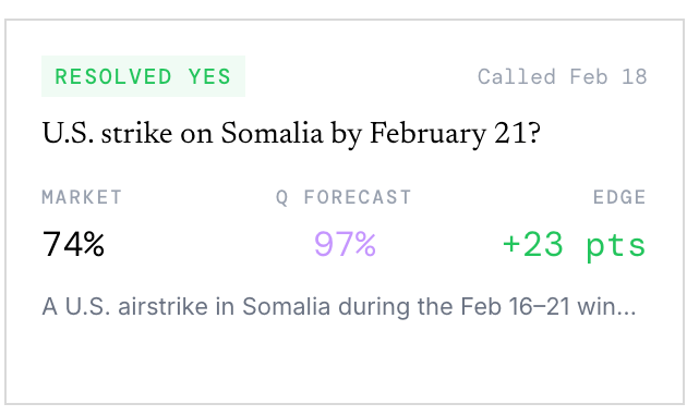Its most impressive win was the U.S. strike on Somalia by February 21 market, where it forecasted a strike within the resolution window at 97% confidence while the market sat at 74%, a 23 point spread.
